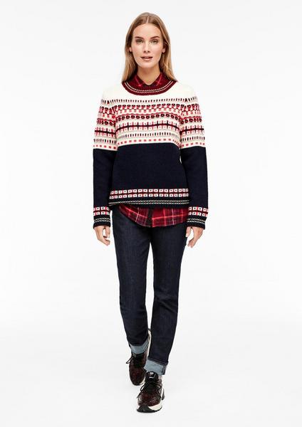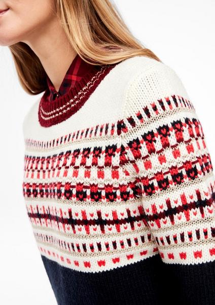 Jacquard-Muster mit unterschiedlichen Garnen an Brustpasse und Abschlüssen, Rundhalsausschnitt mit breiter Rippblende, elastische Rippbündchen, bequeme Passform; Rückenlänge bei Größe 36 ca. 62 cm, hochwertige, warme Strick-Qualität mit Wollanteil