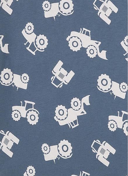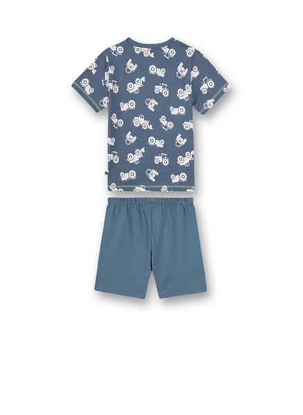 Cooler kurzer BOY AT WORK Jungen-Schlafanzug von Sanetta in Blau/Grau mit Traktor-Alloverdruck auf dem T-Shirt.