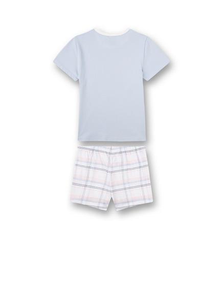 Komfortabler Mädchen-Pyjama von Santta in Hellblau mit karierter Hose und Brillenprint.