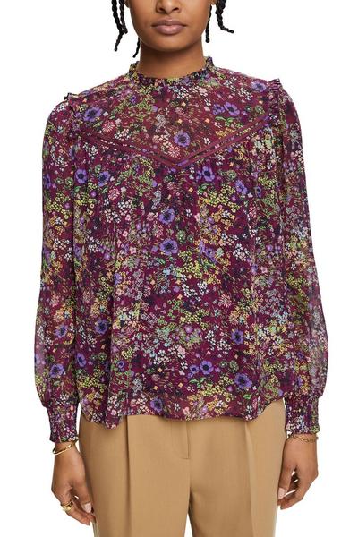 * Rundhalsausschnitt mit Rüschenkante, Knopf und Key-Hole-Detail rückseitig