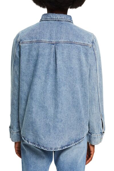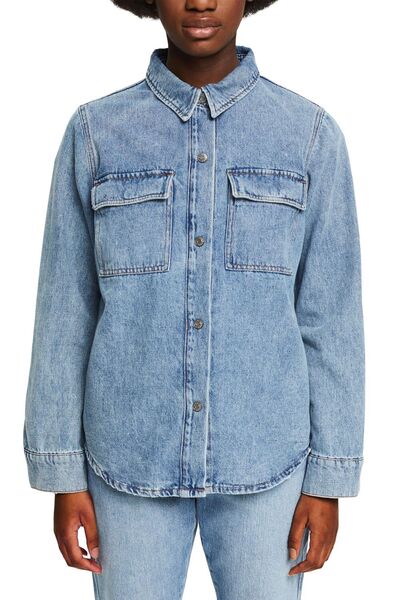 * Denim aus reiner Baumwolle * Umlegekragen * Durchgängige Druckknopfleiste mit verstecktem, dekorativen Stickmuster * Zwei Pattentaschen mit Druckknopfverschluss auf Brusthöhe * Zwei seitliche Eingriffstaschen * Gerade Passform