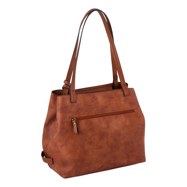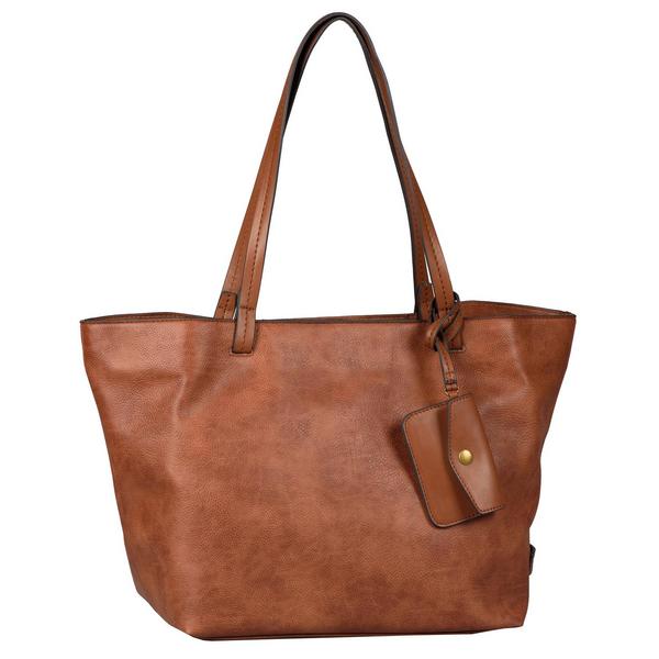 Shopper mit Reißverschlussöffnung und einem Riegel mit Druckknopf zum Verstellen des Formats, 1 Reißverschluss-Rückfach. Innen 1 Reißverschlussfach, 1 Smartphone-Fach, 1 Steckfach, DIN-A4-tauglich, doppelter flacher Tragegriff, 1 abnehmbarer Täschchen-Anhänger mit 1 Druckknopf.