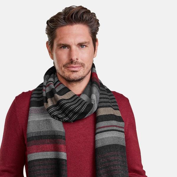 Diese Streifen-Fischgrat Musterkombination braucht Man(n) diesen Herbst einfach unbedingt im Kleiderschrank! Der LERROS Schal mit Schurwollanteil bietet Ihnen nicht nur einen hohen Tragekomfort sondern auch den perfekten Look an kalten Tagen, beispielsweise kombiniert mit lässiger Jeans und Blouson.