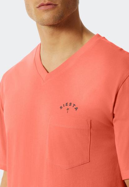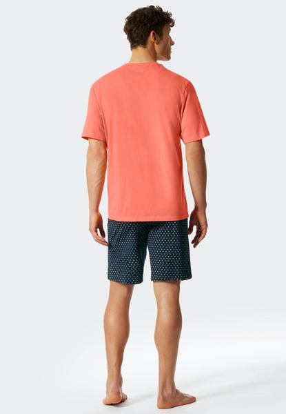 Dieser kurze Herrenschlafanzug ist die perfekte Kombination aus hohem Tragekomfort und maskulinem Design. Hochwertiger Single-Jersey aus 100% Baumwolle macht den Zweiteiler besonders bequem. Dank der verzierten Brusttasche und dem sportlichen V-Ausschnitt wird das papayafarbene Oberteil mit kurzen Ärmeln zum Hingucker. Die dunkelblaue Hose mit kleinen Palmenmotiven in Hellblau runden den Look ab. Sportliche Nachtwäsche, die perfekt sitzt und Spaß macht – natürlich in bester SCHIESSER-Qualität!