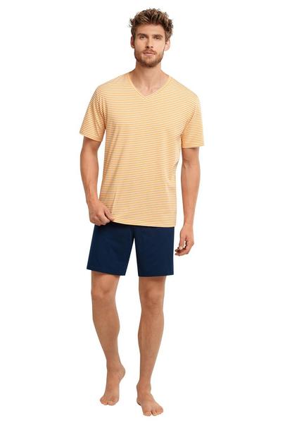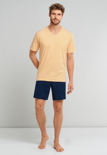 Dieser kurze, curryfarbene Herrenschlafanzug verspricht angenehme Nächte in weichem Single Jersey. Weiße Ringel und der gelb akzentuierte V-Ausschnitt schenken dem T-Shirt einen sportlichen Look, der perfekt durch die nachtblauen Shorts abgerundet wird. Ein unkomplizierter, bequemer Schlafanzug in bester SCHIESSER-Qualität!