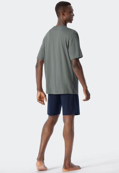 Im stilvollen Look und 100 % weicher Baumwolle überzeugt dieser kurze Schlafanzug anspruchsvolle Herren. Das unifarbene T-Shirt mit Rundhalsausschnitt und Brusttasche bekommt mit den dunkelblauen Shorts mit Kreismuster einen starken Partner. Locker leichter Single-Jersey übernimmt den komfortablen Part und verspricht angenehme Nächte in bester SCHIESSER-Qualität!