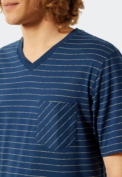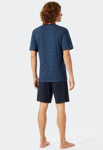 Dieser kurze Herrenschlafanzug in maskulinem Design verspricht angenehme Nächte. Besonders bequem ist der Zweiteiler dank weichem Single Jersey aus 100% Organic Cotton. Feine Ringel in Weiß, die aufgesetzte, schräg gestreifte Brusttasche und der akzentuierte V-Ausschnitt schenken dem blauen Oberteil eine sportliche Note. Abgerundet wird der Look durch die unifarbene Hose in klassischem Dunkelblau. Ein leichter, komfortabler Schlafanzug in bester SCHIESSER-Qualität!