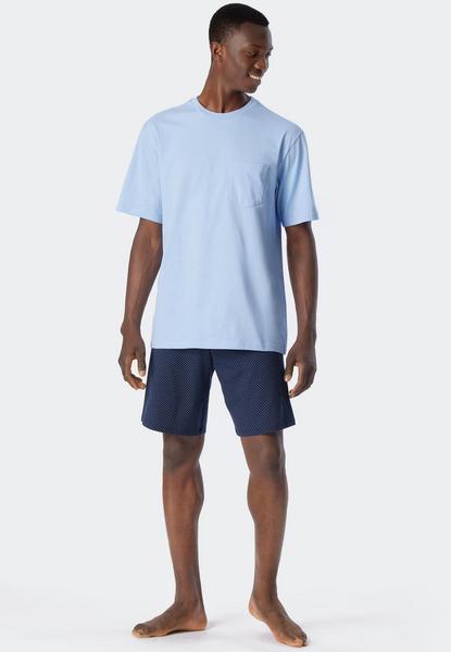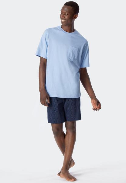 Im stilvollen Look und 100 % weicher Baumwolle überzeugt dieser kurze Schlafanzug anspruchsvolle Herren. Das unifarbene T-Shirt mit Rundhalsausschnitt und Brusttasche bekommt mit den dunkelblauen Shorts mit Kreismuster einen starken Partner. Locker leichter Single-Jersey übernimmt den komfortablen Part und verspricht angenehme Nächte in bester SCHIESSER-Qualität!