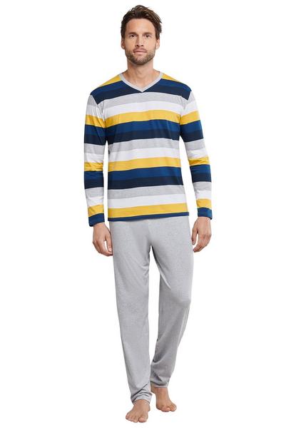 Hoher Tragekomfort trifft bei diesem langen Herren-Schlafanzug auf einen sportlichen Look. Mit seinen Blockringel in Grau, Blau, Gelb und Weiß sowie dem V-Ausschnitt wird das Oberteil zum frischen Blickfang. Die grau-melierte Hose ergänzt das Duo perfekt. Ein maskuliner, komfortabler Schlafanzug in bester SCHIESSER-Qualität aus 100 % Baumwolle - auch in großen Größen erhältlich!