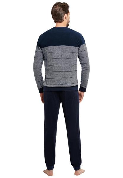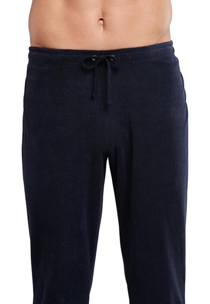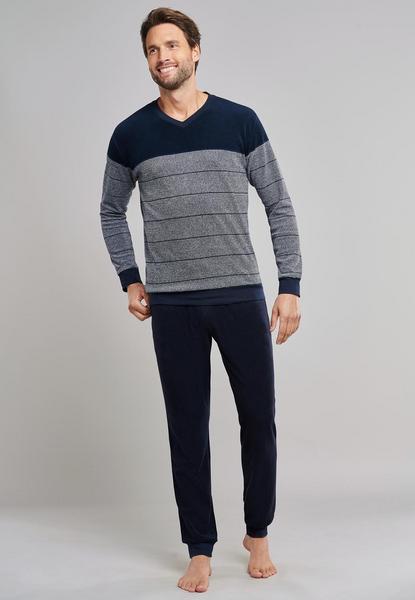 Dieser lange, dunkelblaue Herren-Schlafanzug sitzt dank wärmender Frottee-Qualität besonders bequem, wozu auch die Bündchenabschlüsse an Saum und Ärmeln beitragen. Das Oberteil überzeugt zudem mit blau-grauen Ringeln. Der Look wird mit dem bordeauxfarbenem V-Ausschnitt stimmig abgerundet und die lange Hose ergänzt das Shirt perfekt. Ein Traumduo für entspannte Nächte in bester SCHIESSER-Qualität - auch in großen Größen erhältlich!