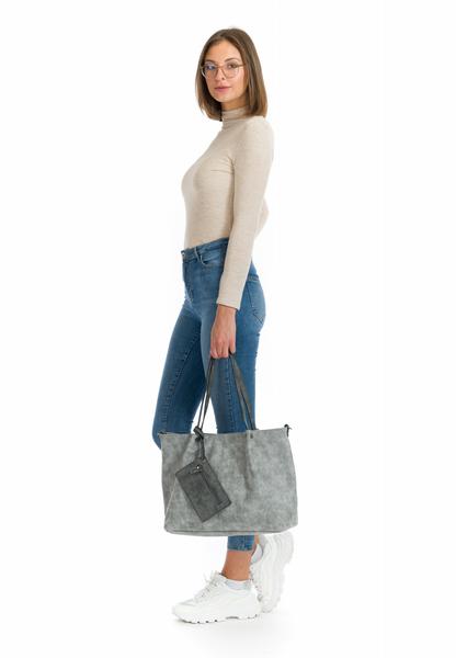 Shopper Bag in Bag Surprise No.3, Kunstleder, mit längenverstellbarem, abnehmbarem Umhängeriemen. Authentisch, selbstbewusst und schön - so zeigen sich Frauen in ihrem aufregenden Alltag. Selbstredend am liebsten mit ihrer Lieblingstasche. Bag in Bag Surprise ist der aufregende Shopper im Uni-Design mit längenverstellbarem, abnehmbarem Umhängeriemen, der wahre Persönlichkeit ausstrahlt. Ob für Büro, Schule oder in der freien Zeit - mit dem Shopper Bag in Bag Surprise lässt sich einfach jedes Abenteuer bestreiten. Ein ganz normaler Shopper. Nein, hier kommt das "Bag in Bag"-Funktionstaschensystem mit der speziellen Überraschung! Im Inneren der großen Tasche findet sich nämlich eine zweite Handtasche, die mit einem beiliegenden Schultergurt als separate Umhängetasche getragen oder mit dem Surprise-CLIP ganz elegant und sicher an der Außentasche befestigt wird. Der Schultergurt kann dann auch einfach am Shopper befestigt werden, sodass dieser wie eine große Umhängetasche auch crossbody getragen werden kann. Das Modell besteht aus Kunstleder und lässt sich mit einem Magnetverschluss verschließen. Mit ihrer glatten Optik und dem Uni-Design ist die hochwertige Handtasche ein echter Hingucker. EMILY & NOAH - für modebewusste Frauen, die wissen, wer sie sind. Mit jedem Accessoire von EMILY & NOAH wird ein ganz und gar individueller Stil geschaffen. Kombiniert mit einer schicken Hose, einem Kleid oder einer angesagten Bluse zeigen die Produkte des Labels wahre Persönlichkeit. Ordnung ist das halbe Leben. Ein Hauptfach ist in der Tasche integriert. Das Modell Bag in Bag Surprise ist von der Haptik eher weich und daher wirklich angenehm zu tragen. Nieten schmücken optisch und heben das besondere Design dieses neuen Favorites hervor. Als Schultertasche ist dieses Modell mit dem angenehmen Umhängeriemen und den zwei Tragegriffen zu tragen. Im hübschen Shopper ist einfach Platz für alles - sogar für ein kleines Mitbringsel zur Einweihungsparty oder ein paar Pralinen für die Schwiegermutter.