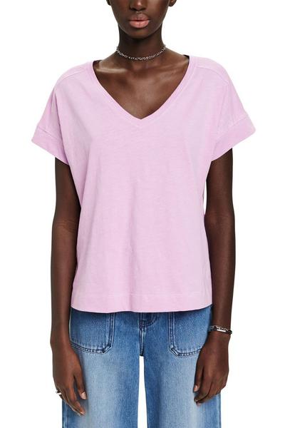 * Jerseyqualität aus reiner Baumwolle * Markantes Sprenkel-Design * V-Ausschnitt * Kurze Ärmel * Gerade Passform