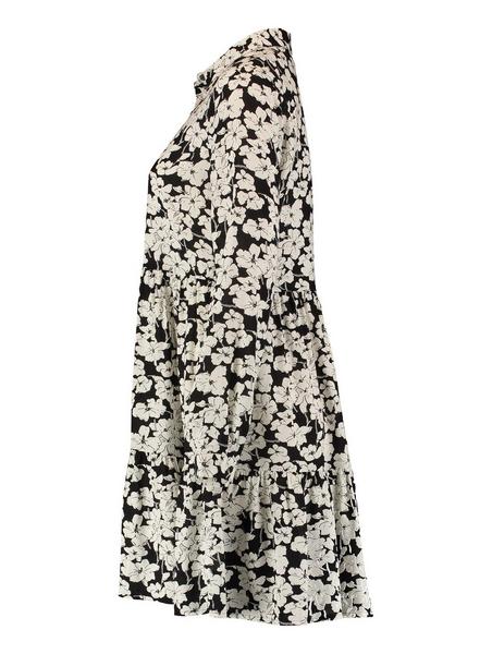 Kleid mit langen Ärmeln und einem Blusenkragen. Es wird ab der Taille weiter und hat eine Knopfleiste auf der Brust. Es hat einen All-Over-Print mit einem Blumenmuster.