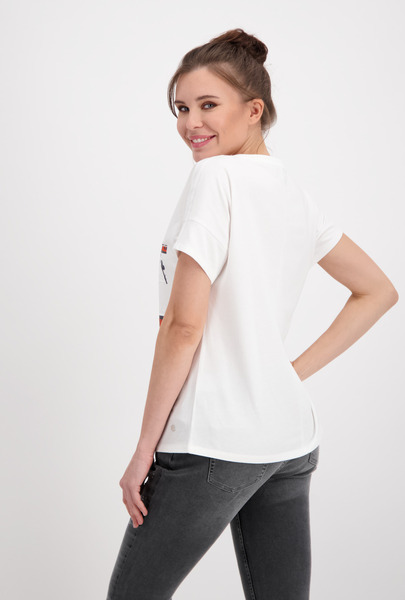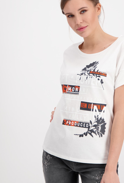 Das Halbarm Jersey T-Shirt von monari, das sich durch seinen modischen Schriftmix aus 3-D-Lackwording mit kontrastfarbiger Schrift, floralem Print und funkelnden Strasssteinchen auf der Vorderseite perfekt auszeichnet. Regular Fit mit überschnittenen Schultern und glitzernden Lurex-Overlocknähten am eingesetzten Streifen auf den Schultern und an der Ärmelnaht. Mit der hochwertigen Baumwoll-Modal-Qualität bietet das Rundhalsshirt den ganzen Tag über einen tollen Tragekomfort. Ganz einfach stylen und zu lässigen Outfits kombinieren.