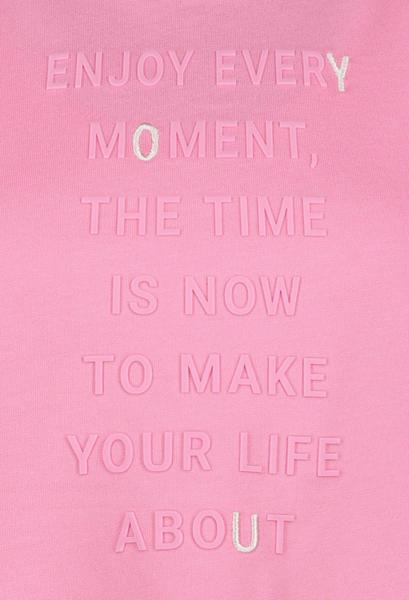 Ein cooles Rundhals-Basic mit Styling-Potenzial von monari. Angesagte Akzente werden durch ein toniges 3-D-Wording mit glänzenden, gestickten Buchstaben auf der Vorderseite gesetzt. Die Form: gerade geschnitten mit angedeutetem, überschnittenem Kurzarm und Bündchen an den Ärmelenden. Der Mix aus Baumwolle und Modal verspricht ein wohliges und sehr hochwertiges Tragegefühl für jeden Tag. Seien Sie gespannt!