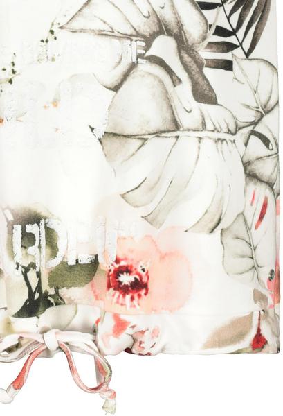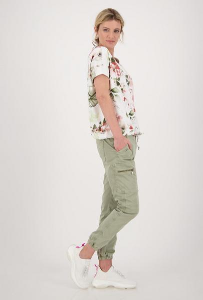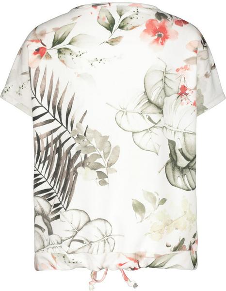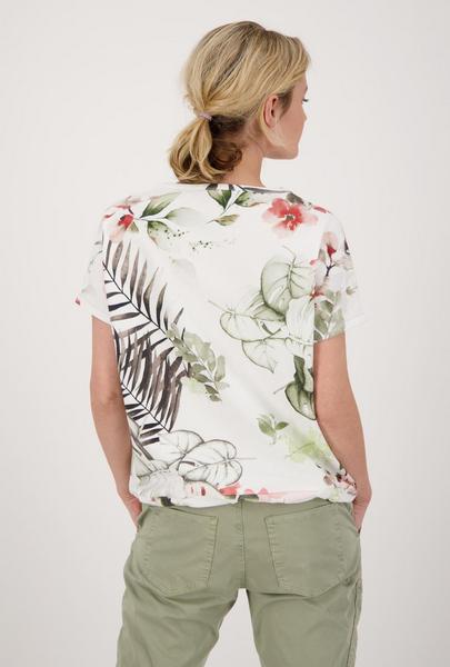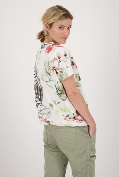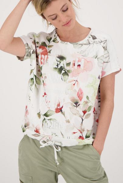 Das Rundhals Modell von monari wird auf jeden Fall eines Ihrer Lieblings-Unikate in Ihrem Kleiderschrank. Der Druck aus schönen Blumen und Blüten wird bei jedem T-Shirt unterschiedlich und einzigartig platziert. Der Fit: gerade geschnitten mit Rundhals, angedeutetem, überschnittenem Kurzarm und einem breiten Bündchen am Saum mit Tunnelzug und Bindeband. Details: Ärmelenden mit Lurex-Overlocknaht, weißes, unifarbenes Band entlang der Ärmel und neben dem floralen Allover-Print stilvolle Rubber-Print-Schrift auf der Vorderseite. Werden Sie Besitzer dieses Jersey Unikates aus reiner, angenehm zu tragener Baumwolle!