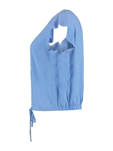 Kurze Bluse mit Knopfleiste zum Binden. Ärmeln mit Wellenkante ohne Kragen.