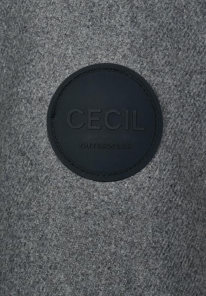 Warm in die neue Saison! Der Mantel von CECIL begeistert im sportiven Look und mit kuscheliger Woll-Optik. Der 2-Wege Reißverschluss wird durch eine Druckknopfleiste ergänzt und schützt so vor eindringendem Wind. Die Vorderseite hat außerdem zwei große, aufgenähte Taschen und zwei Taschen weiter oben mit Reißverschluss. Die Kapuze hat ein Tunnelzugband mit Stopper und auch die Taille und der Saum werden durch ein Tunnelzugband mit Stopper vervollständigt.\n\n\n Mantel in Woll-Optik\n 2-Wege Reißverschluss und Druckknopfleiste\n Kapuze mit Tunnelzugband und Stopper\n Zwei Stecktaschen und zwei Taschen mit Reißverschluss\n Tunnelzugband an der Taille und am Saum\n Maße bei EU-Größe M ca.:\n Länge 85 cm, Brust 57 cm, Saumweite 60 cm\n Material: Oberstoff: 75% Polyester, 20% Wolle, 2% Polyacryl, 2% Viskose, 1% Polyamid, Futter: 100% Polyester, Wattierung: 100% Polyester