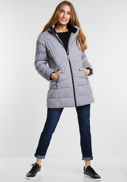 Der Mantel macht mit dem hohen Stretchanteil jede Bewegung mit und bietet Bequemlichkeit. Optisch überzeugt er mit der schönen Steppung und praktischer Länge. Die Kapuze ist innen super weich und lässt sich auch ganz einfach abnehmen. Auch der Kragen liegt angenehm auf der Haut und die Fronttaschen bieten den besten Platz für alle wichtigen Utensilien. Zusätzlich bietet die strahlenabweisende Innentasche Stauraum und der Mantel punktet noch mit weiteren Gimmicks: ein Thermometer zeigt an wie warm es in der Jacke ist und die reflektierenden Details setzen zusätzliche Highlights. So wird der Mantel zum praktischen Begleiter für die kalten Tage.\n\n Stretchiger Mantel mit reflektierenden Details\n Weiche Fronttaschen und Rippstrick in den Ärmeln\n Abnehmbare Kapuze und weicher Kragen\n Thermometer und strahlenabweisende Innentasche\n Maße bei EU-Größe XS ca.:\n Länge 87cm, Breite 53cm, Taille 53cm\n Material: Oberstoff: 100% Polyester Futter: 100% Polyester, Füllung: 100% Polyester\n\n