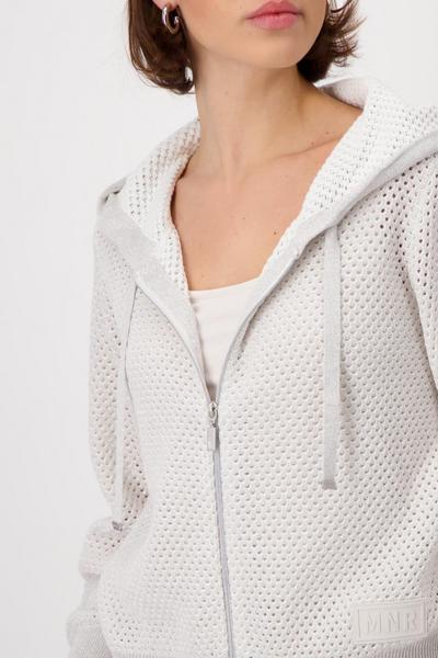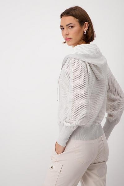 Edle Strickjacke aus hochwertiger Baumwolle und glitzerndem Lurex. Mit Ajourmuster und tonigem Patch.