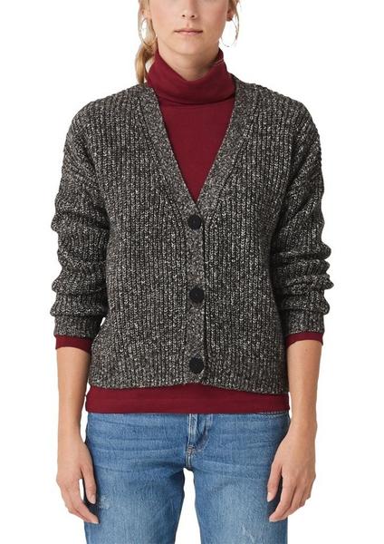Jacke im Grobstrick-Look mit melierten Effekten, V-Ausschnitt und durchgehende Knopfleiste mit Blende, Ärmel und Saum ebenfalls mit Rippblende, bequeme, gerade Passform; Rückenlänge bei Größe S ca. 54 cm, angenehm zu tragende, leicht elastische Strick-Qualität,