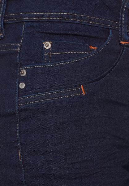 Denim Love! Dunkelblaue Slim Fit Damenjeans im Style Toronto von CECIL. In High Waist und mit Straight Legs setzt sie auf einen easy Fit. Der 5-Pocket Style und der Reißverschluss mit Knopf wirken klassisch und machen die Denim zum Kombi-Star.