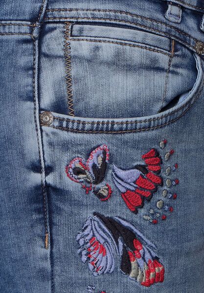 Stick-Wunder! Bequeme Loose Fit Damenjeans mit Middle Waist im Style Scarlett von CECIL. Die Stickereien an den Seiten setzen tolle Akzente auf der mittelblauen Waschung. Ergänzt wird der 5-Pocket Style durch einen Reißverschluss mit zwei Knöpfen.
