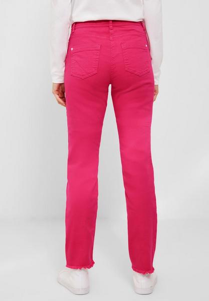 Farbkick! Die Slim Fit Damenhose im Style Toronto von CECIL sorgt für Abwechslung im Kleiderschrank. Im angesagten Colour-Style macht sie einfach gute Laune und der ausgefranste Hosensaum ist ein lässiger Hingucker. Mit hohem Bund und geradem Bein formt sie eine vorteilhafte Silhouette. Ein Reißverschluss mit zwei Knöpfen ergänzt den 5-Pocket-Style.