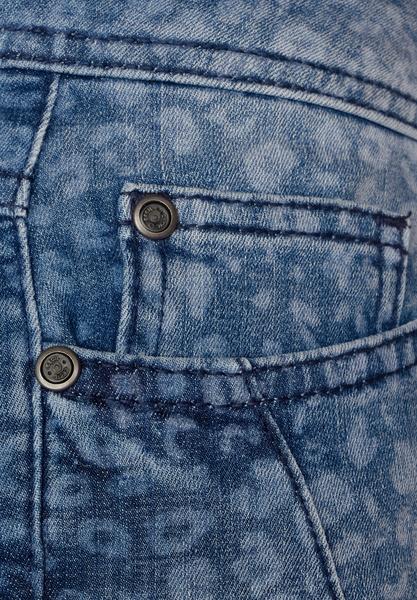 Animal Print! Die Slim Fit Denim im Style Charlize von CECIL wird durch ein cooles Leomuster auf der blauen Waschung zum absoluten Styling-Highlight! Die Slim Legs werden damit hervorragend in Szene gesetzt und das elastische Material sitzt formschön und ermöglicht einen hohen Tragekomfort. Der Reißverschluss mit Knopf und fünf Taschen runden den Look klassisch ab.\n\n\n Slim Fit Denim mit Crash-Effekt\n Middle Waist und Slim Legs\n Leomuster auf blauer Waschung\n 5-Pocket Style\n Reißverschluss und Knopf\n Maße bei Inch-Größe 26/28 ca.:\n Innenbeinlänge 71 cm, Fußweite 15 cm\n Material: 80% Baumwolle, 18% Polyester, 2% Elasthan