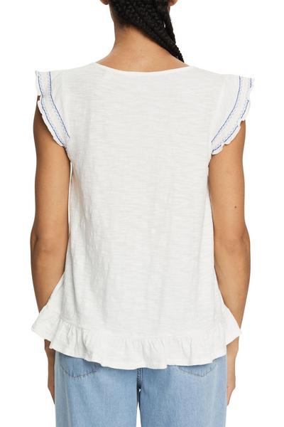* Fein strukturierter Jersey aus Baumwolle * Kelchausschnitt * Stickerei aus kontrastfarbenem Garn * Lochstick-Elemente * Kurze Ärmel mit Rollsaum * Kleiner Volantsaum * Lockere Passform