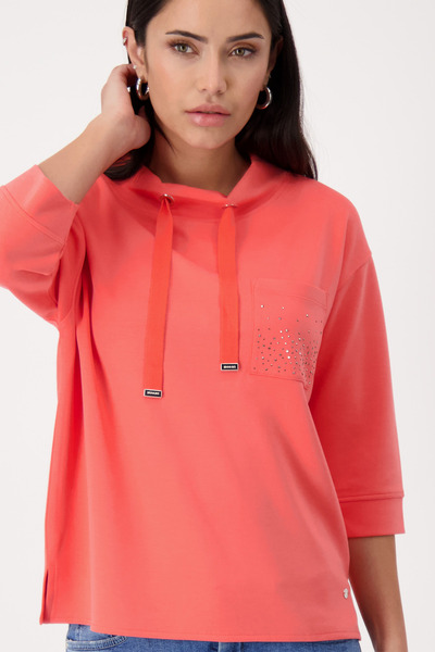 Das Sweatshirt besticht durch seine sanfte Haptik und die aufgesetzte Brusttasche mit funkelnden Strasssteinen.