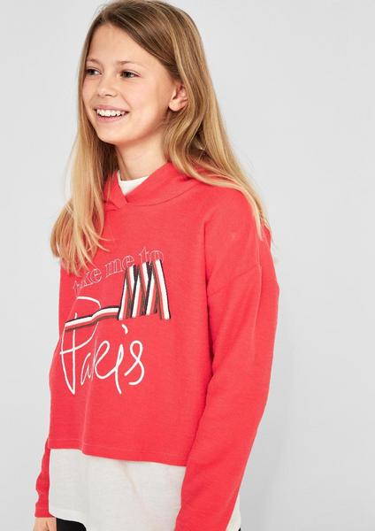 Sweatshirt im Inside Out-Look , Kapuze mit Streifen-Tape innen, großer, teilweise gummierter Print auf der Front, Label-Patch am linken Ärmel, kurze, weite Passform; Rückenlänge bei Größe M ca. 44 cm, leichte Felpa-Qualität aus reiner Baumwolle