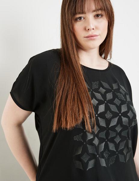 Rücken aus softem Jersey. Front aus fließender Web-Qualität. Shining! Ein tolles Shirt, das mit seinem schimmernden Folienprint und Steinchendekor sofort ins Auge fällt. Für angenehmen Tragekomfort sorgt der Material-Patch aus fließender Web-Front und softem Jersey-Rücken. Der abgerundete Saum lädt zum lässigen Drübertragen ein. Ein raffiniertes Must-have, das sich easy kombinieren lässt.
