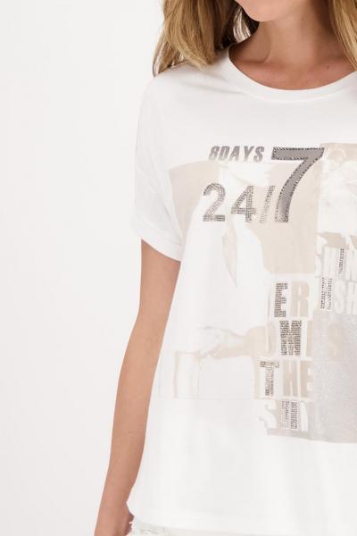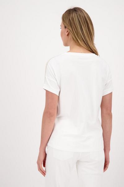 Das monari T Shirt aus der Kategorie Damen Shirts ist die unkomplizierte Antwort auf die Frage: Was ziehe ich bloß an. Dieses Shirt mit Druck auf der Vorderseite hat coole Kontraststreifen auf den Ärmeln. Die gerade Passform wird von einem Rundhalsausschnitt, Halbarm mit Ärmelaufschlag und einem abgerundeten Saum ergänzt. Der bereits erwähnte Druck auf der Vorderseite wird von Glitzerdruck und Glitzerschrift geschmückt. Das Damen T Shirt erhält so einen glamourösen Effekt. Damit der Casual Look komplettiert wird empfehlen wir Ihnen eine weiße Jeans und sportliche Sneaker zu kombinieren.