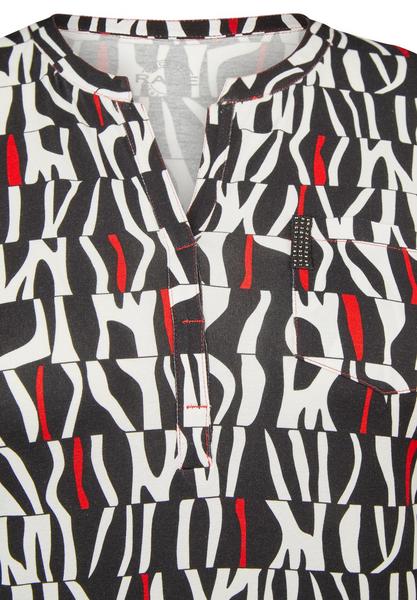 Diese feminine Bluse ist aus einem Viskose-Elasthan-Mix gefertigt. Die Brusttasche ist dezent mit Strass verziert. Das Muster in Schwarz-Weiß und der Kontrastfarbe zieht alle in seinen Bann. In Kombination mit einer Lederleggings entsteht ein moderner Look.