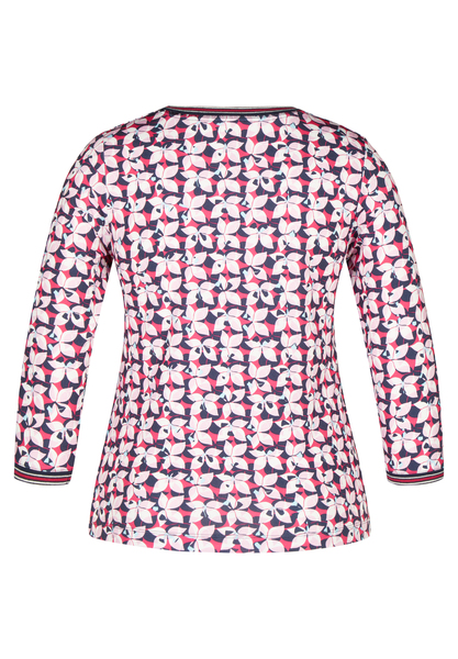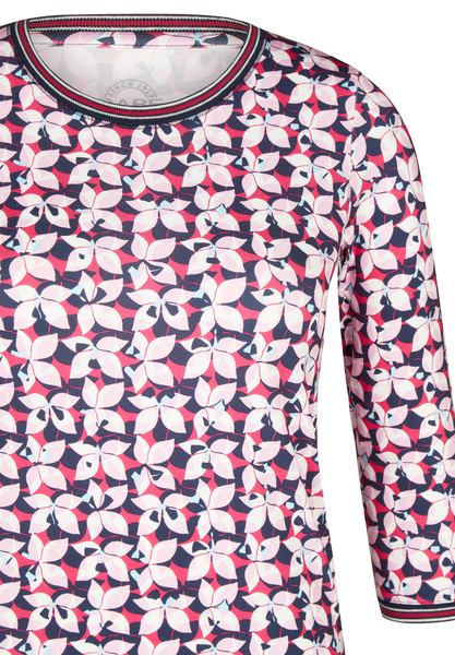 Aus feinster Viskose wurde dieses T-Shirt gefertigt. Das abstrakte Muster ist ein absoluter Eyecatcher. Der Rundhalsausschnitt und der Ärmelsaum sind jeweils in den gleichen Farbtönen abgeschlossen. Für einen Easy-Look kombinieren Sie das T-Shirt zu einer Radlerhose und Sandaletten.