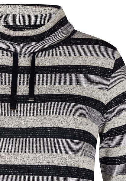 Es glitzert und funkelt in diesem Shirt mit Wasserfallkragen und Bindebändern durch fein eingearbeitetes Glanzgarn, eigearbeitet im Streifenmuster. Tragen Sie dieses feminine T-Shirt zu Ihrer Lieblingsjeans und Slippern.