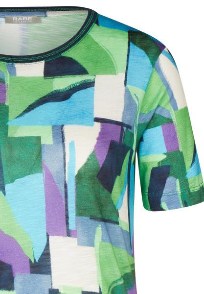 Entdecken Sie unser einzigartiges T-Shirt mit Kurzarm und abstraktem Muster! Das T-Shirt bietet einen bequemen Rundhalsausschnitt mit einer stilvollen Strickblende. Durch die überschnittenen Schultern erhalten Sie einen modernen und lässigen Look. Der untere Saum ist mit einem praktischen Gummizug versehen, der für eine bequeme Passform sorgt. Hergestellt aus hochwertiger Baumwolle und Viskose, bietet Ihnen dieses T-Shirt einen angenehmen Tragekomfort und eine optimale Atmungsaktivität. Holen Sie sich dieses trendige und vielseitige T-Shirt, das perfekt für jeden Anlass ist!