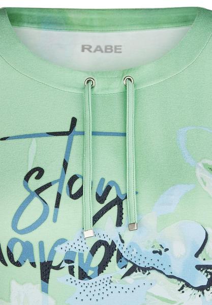 Dieses raffinierte T-Shirt in leichter Aquarell-Optik und mit tonalem Strass setzt ein absolutes Fashion-Statement. Die Zugbänder am Kragen setzen verspielte Akzente. Dank hochwertiger Viskose wird ein leichter Kühlungseffekt erzeugt für ein super angenehmes Hautgefühl. Kombinieren Sie Ihr neues Lieblingsteil mit einer weißen Radlerhose und Sneakern.