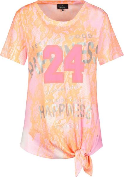 Hingucker Effekt – mit diesem schönen Damen Rundhals T Shirt von monari ergänzen Sie Ihren Kleiderschrank um ein absolutes It-Piece. Das Regular Fit Shirt mit Blumenmuster wird durch ein stilvolles Knotendetail am Bund aufgelockert und verleiht Ihrem Alltagsoutfit eine lässige Note. Die Vorderseite schmückt sich mit femininer Glitzerschrift. Die Baumwollmischung mit Modal trägt sich angenehm auf der Haut. Das muss Frau einfach haben! Es gibt unzählige Outfit Ideen mit diesem T-Shirt Damen. Kombinieren Sie beispielsweise zur coolen Denim Jeans.