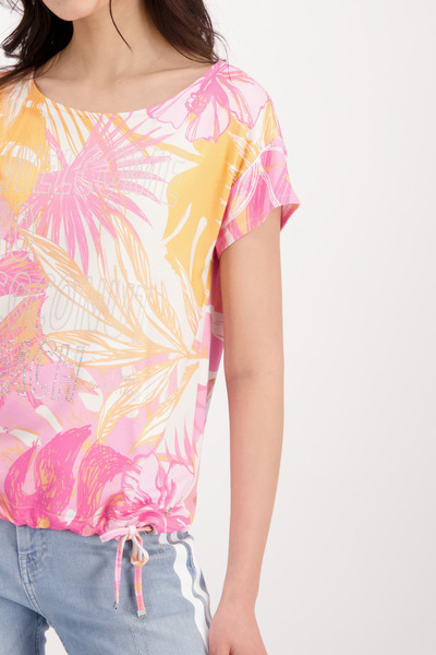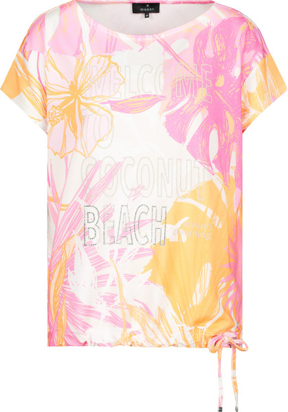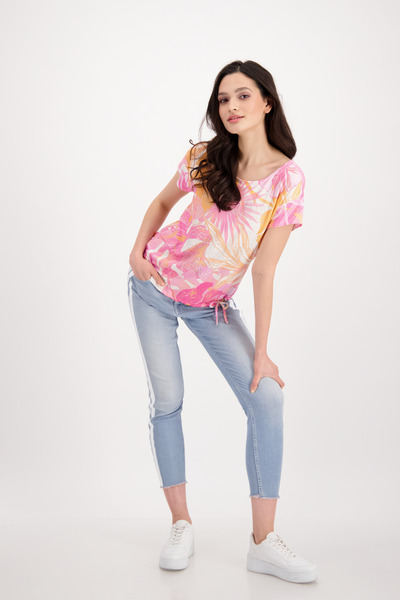Das Rundhals Shirt von monari ist ein lässiges Essential mit Kurzarm und leicht überschnittenen Schultern. Das Blumenmuster mit herausstechender Glitzerschrift auf der Vorderseite setzt einen trendigen und glamourösen Akzent. Für maximalen Tragekomfort trägt neben der Qualität aus fließender Viskose, weichem Modal und Elasthan auch die Regular Fit Passform mit Rundhalsausschnitt bei.