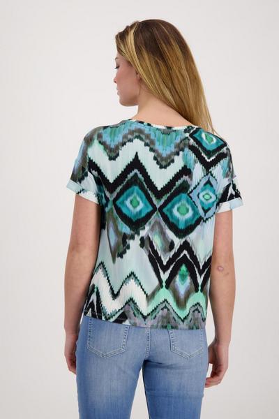 In harmonisch abgestimmten Farben präsentiert sich dieses schöne T Shit mit Ikat Muster von monari. Fließende Viskose verleiht dem Muster Shirt komfortable Trageeigenschaften. Die Regular Fit Linie mit Halbarm, Ärmelaufschlag und einem Rundhalsausschnitt mit Blende, machen das modische Damen T Shirt zu einem idealen Begleiter für gepflegte Outfits. Es lebe die Vielfalt von diesem stilvollen Ikat Shirt.