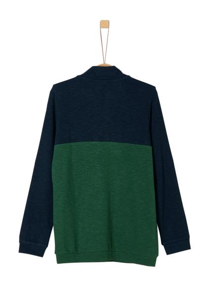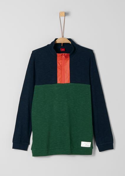ausgeprägte Flammgarnstruktur und Colour Blocking-Design, Stehkragen und kurzer Reißverschluss mit Kontrastbeleg, Rippbündchen an Ärmeln und Saum, bequeme Passform; Rückenlänge bei Größe M ca. 59 cm, hochwertige Slub Yarn-Qualität aus Baumwolle