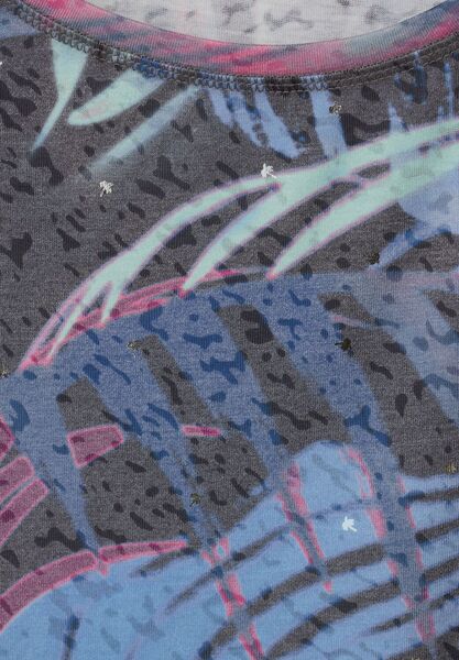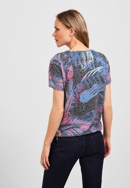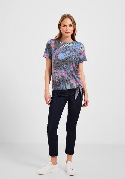 Hawaii is calling! Farbenfrohes Damen T-Shirt von CECIL mit U-Boot Ausschnitt. Ein Trendteil, das mit seinem Multicolor Burn Out Blätterprint mit Foliendessin auf einen sommerlichen Look setzt. Das Knotendetail im Saum ergänzt den Look. T-ShirtBlätterprintBurn Out OptikFoliendessinU-Boot Ausschnitt Maße bei EU-Größe M ca.:
