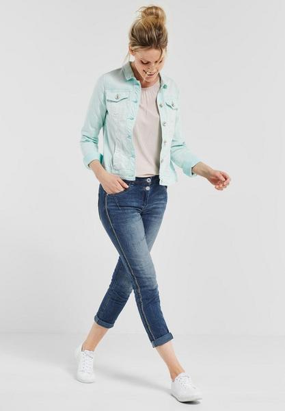 Liebe zum Detail: die Tight Fit Denim punktet mit stylischen Galon Streifen. Auch der Crash-Effekt zeichnet den Look aus und die Hosenbeine sind schmal geschnitten. Abgerundet wird das Design durch den klassischen 5-Pockets Style und dem Doppelknopf am Bund. In mittelblauer Waschung lässt sich die Denim easy kombinieren.\n\n\n Tight Fit\n Middle Waist\n Slim Legs\n Galon Streifen\n Crash-Effekt\n 5-Pockets Style\n Maße bei Größe 26/28 ca.:\n Innenbeinlänge 69cm, Leibhöhe 26cm, Fußweite 15cm\n Material: 65% Baumwolle, 30% Polyester, 3% Viskose, 2% Elasthan\n\n