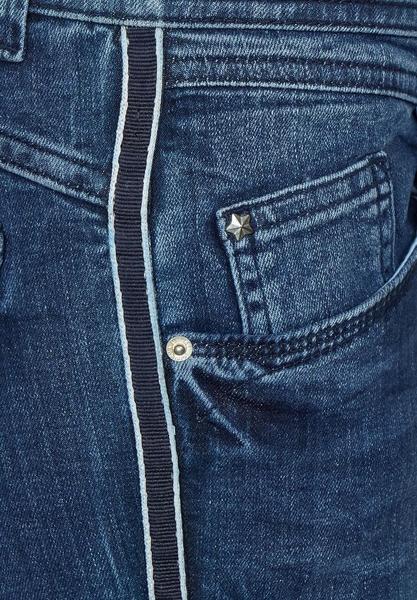 We love Denim: Die Tight Fit Denim macht mit ihren Slim Legs eine tolle Silhouette! Der seitliche Galonstreifen setzt ein kleines Highlight, ebenso der schimmernde Patch am Bund. Die Crinkles auf dem Oberschenkel machen den lässigen Style aus und die mittelblaue Waschung ergibt einen tollen Farbton. Hier lässt sich einfach alles zu kombinieren: Bluse, Pulli, T-Shirt oder Jacke.So universell un so angenehm zu Tragen!\n\n\n Tight Fit Denim\n Mid Rise und Slim Legs\n 5-Pocket Style\n Seitlicher Galonstreifen\n Schimmernder Patch am Bund\n Zipper und Metallknopf\n Crinkles auf dem Oberschenkel\n Mittelblaue Waschung\n Maße bei Inch-Größe 26/26 ca.:\n Innenbeinlänge 81cm, Fußweite 15cm\n Material: 98% Baumwolle, 2% Elasthan