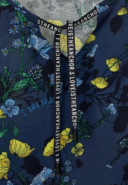 Blumiges Tunika Shirt! Besonders das florale Muster verleiht dem Shirt von CECIL diese tolle Ausstrahlung. Der geschlitzte Rundhalsausschnitt wird durch verstellbare Bändchen mit Schriftzug perfekt in Szene gesetzt. Trotz der Highlights lässt sich das Shirt im Tunika-Style super vielseitig und einfach kombinieren. Super soft liegt der Materialmix auf der Haut und macht das Shirt zum Wohlfühlteil für den Alltag.\n\n\n Shirt im Tunika-Style\n Blumenmuster und Schriftzüge\n Geschlitzter Rundhalsausschnitt mit Bändchen\n Geraffter Elastiksaum\n Elastischer Materialmix\n Maße bei EU-Größe M ca.:\n Länge 67 cm, Brust 54 cm, Saumweite 56 cm\n Material: Vorderseite: 100% Viskose, Rückseite: 50% Baumwolle, 50% Modal