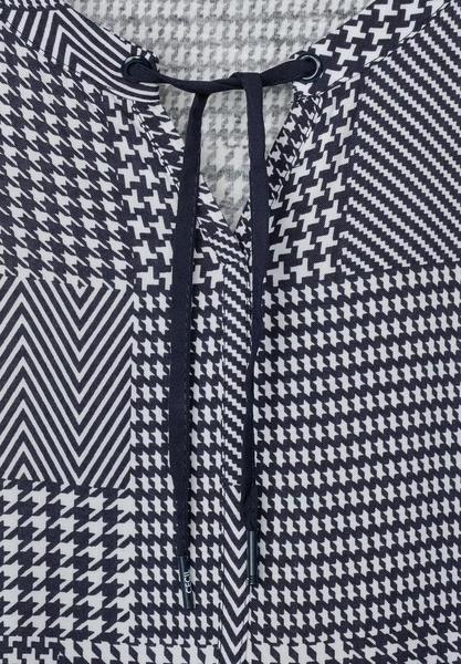 Was für ein Mustermix: Wellenlinien, ZickZack-Streifen und Hahentritt in verschiedenen Größen - das alles findet sich auf dem Mustermix-Shirt wieder. Die 3/4 Ärmel, der Elastikbund und das Bändchendetail geben die lässige Note. Das Shirt sitzt locker und luftig und fühlt sich durch den Materialmix von Viskose, Baumwolle und Modal sehr soft an. Da das Shirt an sich schon sehr auffällt, kombiniert man dazu am besten eine schlichte Hose oder Denim. Und wer es etwas mutiger mag, der setzt ein farbiges Detail mithilfe eines Tuchs oder Schals in Kickfarbe.\n\n\n Shirt mit Hahnentrittmuster in verschiedenen Größen\n Mustermix\n Elastiksaum\n Bändchendetail am geschlitzten Rundhalsausschnitt\n Materialmix\n 3/4 Ärmel\n Maße bei EU-Größe 38 ca.:\n Länge 67cm, Brust 52cm, Saumweite 56cm\n Material: Vorderseite: 100% Viskose, Rückseite: 50% Baumwolle, 50% Modal