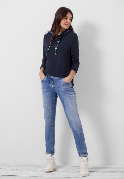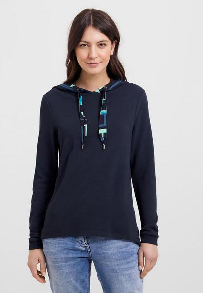 Feel good! Modernes, unifarbenes Damenshirt in Ottoman von CECIL. Im Hoodie Style zeigt es sich mit Kapuze, gemustertem Tunnelzugband und Kontraststreifen am Ärmelsaum. Ein lässiges Oberteil, das einfach nur Spaß macht!
