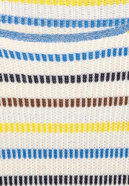 Bunter Mix: Der Pullover von CECIL ist mit einem mehrfarbigen Streifenmuster bedeckt und lässig geschnitten! Denn die überschnittenen Schultern geben Bewegungsfreiheit und der elastische Materialmix passt sich an die Figur an. Der Saum wird durch ein Tunnelzugband mit Knotendetail verziert.\n\n\n Pullover mit buntem Streifenmuster\n Rundhalsausschnitt\n Überschnittene Schultern\n Tunnelzugband mit Knoten am Saum\n Elastischer Materialmix in Rippstrick\n Maße bei EU-Größe M ca.:\n Länge 65 cm, Brust 55 cm, Saumweite 54 cm\n Material: 60% Baumwolle, 40% Viskose